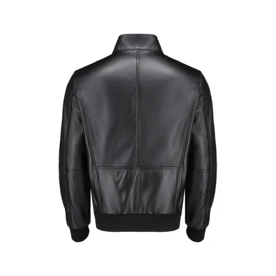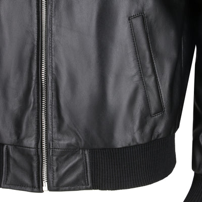 - Premium black leather bomber jacket.