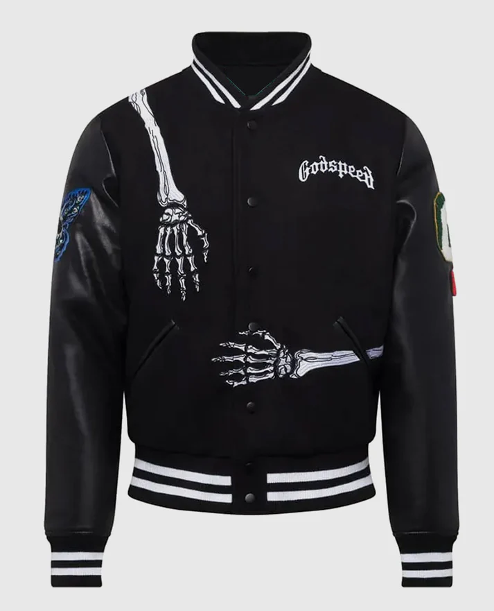 This Men Godspeed Skull Rod Black Varsity Jacket has a cool design of skeleton hands on front and and skull printed on back.the sleeves of this jacket made up of 100% real leather and for outside there is a soft high quality foam type clothes is used which keep you warm from cold.also we provide free shipping in UK.USA and globally all over the world.