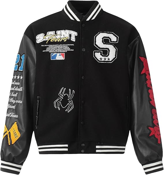 Mens Saint Savior Graphic Print Varsity Jacket Vintage Baseball Streetwear Coat with Embroidered Patches