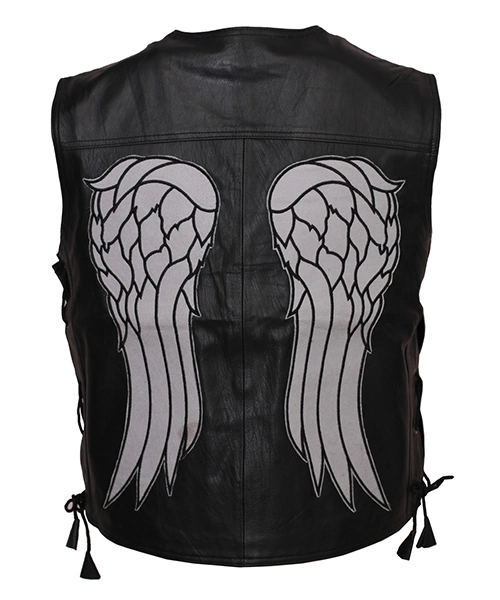 This awesome vest is called Walking Dead Daryl Dixon Angel Wings Black Leather Vest, It’s got that signature Daryl style with the cool angel wings on the back. The black leather looks super tough and durable, perfect for any survivor out there. The vest features button closures down the front, making it easy to put on and take off. The side laces add a nice touch of detail and allow for a customizable fit. Multiple pockets give you plenty of space to stash your essentials, whether you’re out on a run or just going about your day. The overall design is sleek and edgy, capturing the essence of Daryl’s character.also we provide free shipping in UK,USA and globally all over the world.